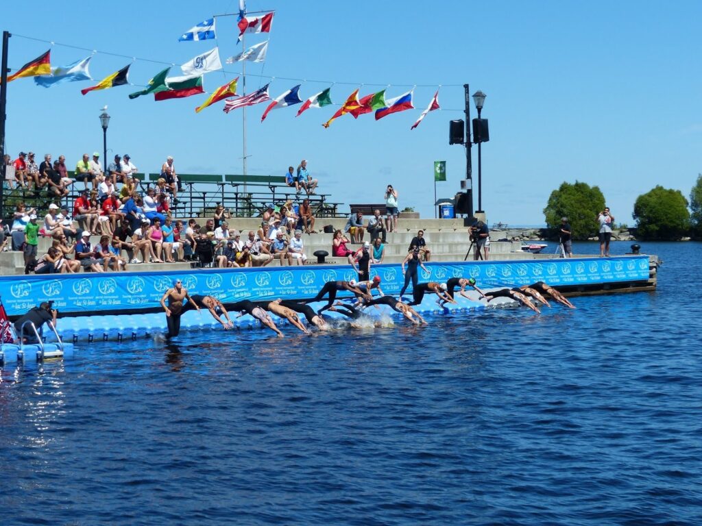 Photo by Lucie Drolet on left of the FINA 10K Marathon Swimming World Cup race in Roberval, Canada as part of the Traversée internationale du lac St-Jean shows how at least a few marathon swimmers are not too concerned about their start from the start pontoon.