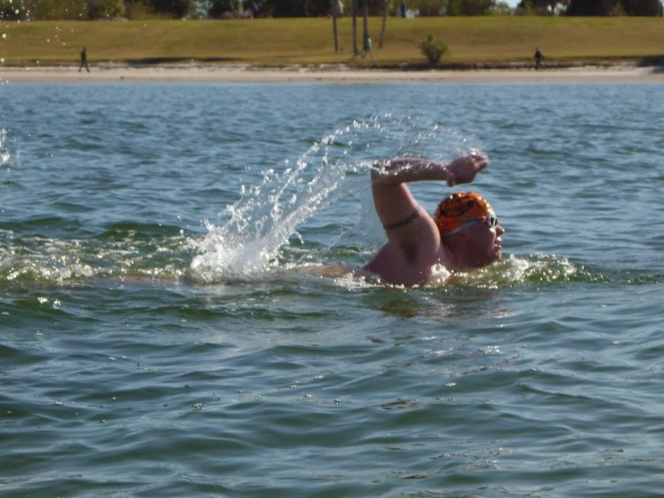 As the swimmers gathered, the air temperature was much lower at 39ºF, but it rose to 65ºF later. “Florida is awesome in the winter,” said Collins who kayaked for JC Malick in his characteristic bioprene.