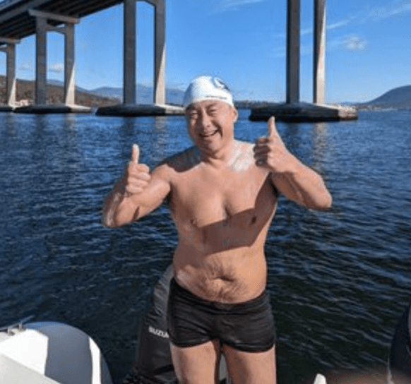 They both swam 29.6 km from the Bowen Bridge to the Iron Pot lightHouse on Iron Pot Island at the mouth of the Derwent River in Storm Bay in 9 hours 53 minutes, organized by Val Kalmikovs.
