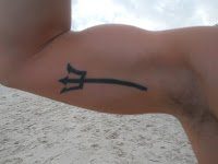 The Poseidon trident is celebrated by the tattoo of Olympian and 2010 world 25K champion Alex Meyer of the USA is simple, yet profound. The trident is associated with Poseidon, the god of the sea in Greek mythology, and its Roman god equivalent Neptune. Poseidon, the god of the sea, used his trident to create water sources in Greece and was known as the Earth Shaker because when he struck the earth he caused earthquakes and he used the trident to create tidal waves, tsunamis and sea storms.