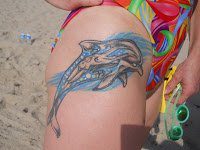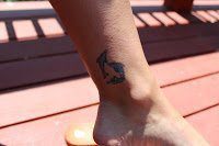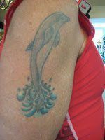 The other tattoo is a dolphin that I had put on after a bull dolphin wouldn’t let me swim into the Bay where I found out later there was a Great White Shark waiting.”