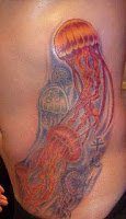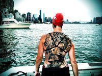 Bruckner Chase (left) has a large jellyfish and whale tails colorfully inked on his torso.