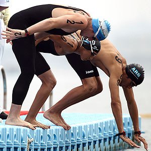 * The swimmers can swim as close to one another or as far apart from one another as they wish. However, their final time is the time of the last swimmer.