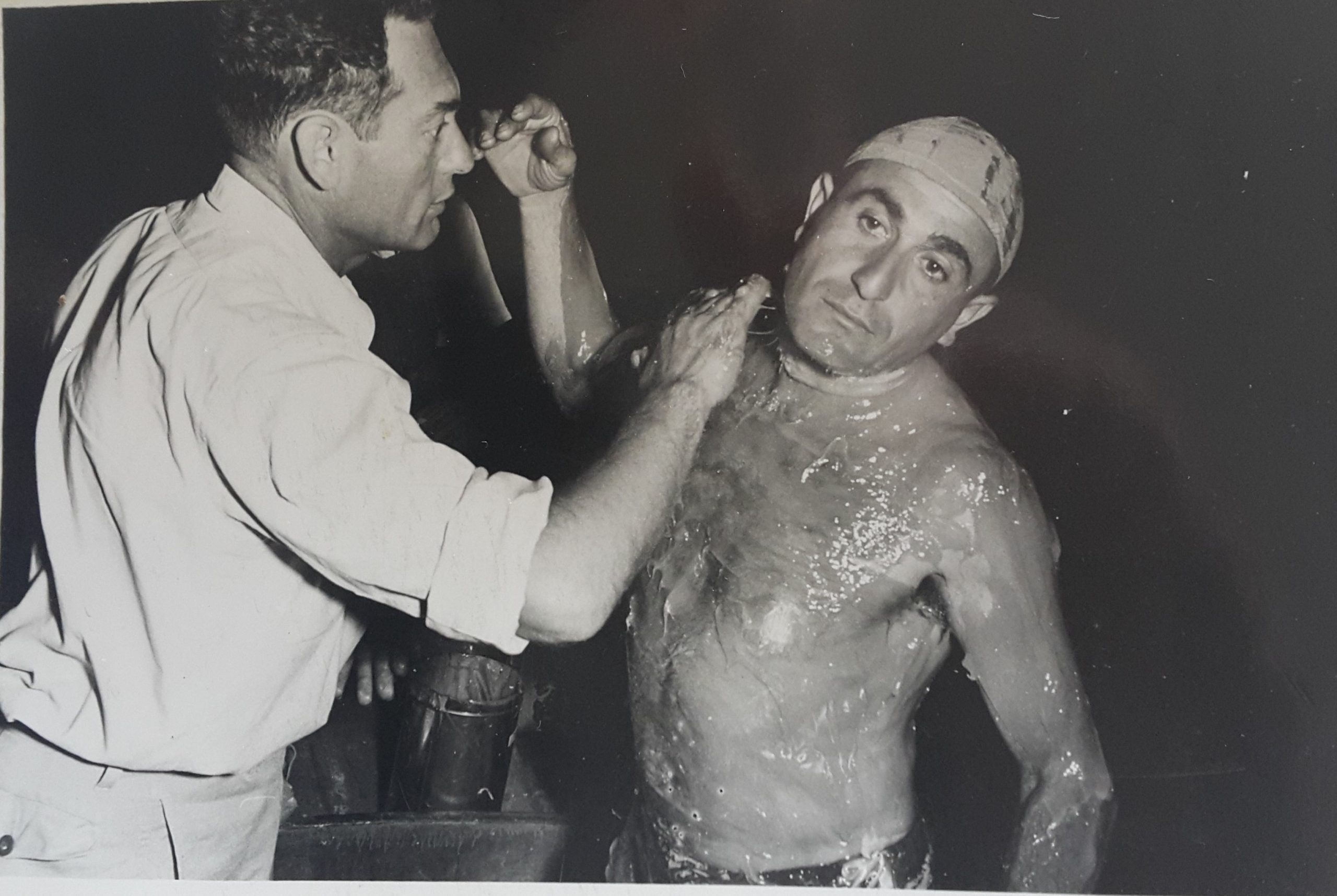 On page 185, Yehezkel was described in translated English as follows: “Born in 1921, in USSR; was a gymnast and swimmer at ‘Hapo’el’ Tel-Aviv; the first to swim lengthwise across the Sea of Galilee from Zemach to Tabcha (1944 – 9:39.44 hours); he had done that 3 times, his best achievement 8:33.02 hours) and swam 10 times across the Sea of Galilee (his best achievement 2:54.50 hours); gymnastics and swimming instructor.”