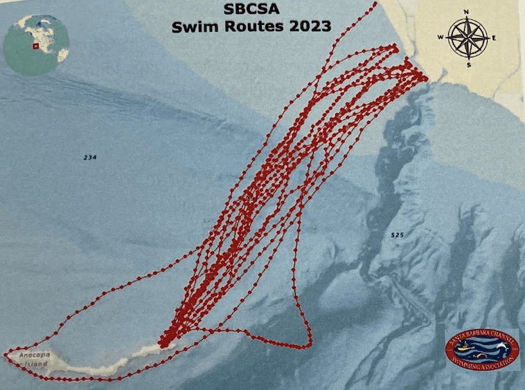 For more information on swims with the Santa Barbara Channel Swimming Association, visit santabarbarachannelswim.org. The map of the swim routes by the swimmers listed above are compiled below by John McCarthy.