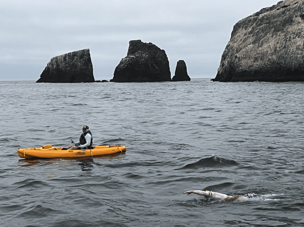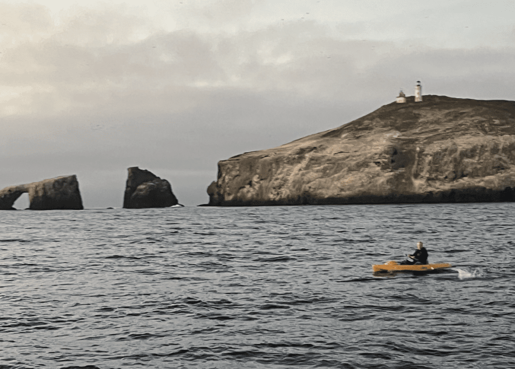 Anacapa Island is a small volcanic island located 19.6 km off the coast of Port Hueneme, Oxnard, California. It is part of the California Channel Islands, a chain of eight islands located off the coast of Southern California. Five of the islands are part of the Channel Islands National Marine Sanctuary, a stunningly beautiful – and challenging – location for channel swimming. Swimmers often find themselves swimming with seals, sea lions, and dolphins while their escort crews are treated to whale sightings. Occasionally, multiple pods of dolphins create stampedes that cruise by swimmers and their crews.
