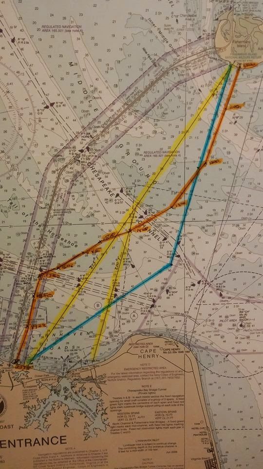 He explains his plans, hopes and actual course noted in the marine chart on left. “The yellow route is the [shortest] straight shot. The blue was my expected route based on the tides and a 5 am start. The route in orange was my actual route with waypoints.”