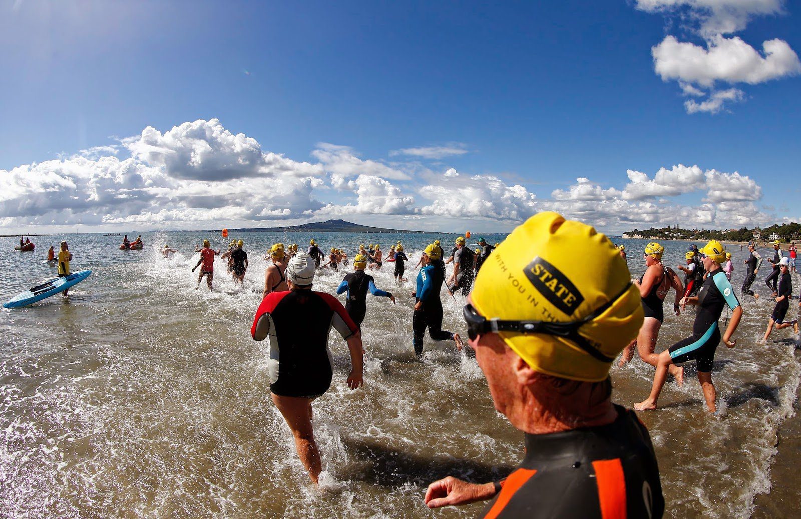 Photo shows the start of the 2.8 km State King of the Bays on Auckland’s North Shore with Rangitoto Island in the background, the sixth and final race of the New Zealand Ocean Swim series.