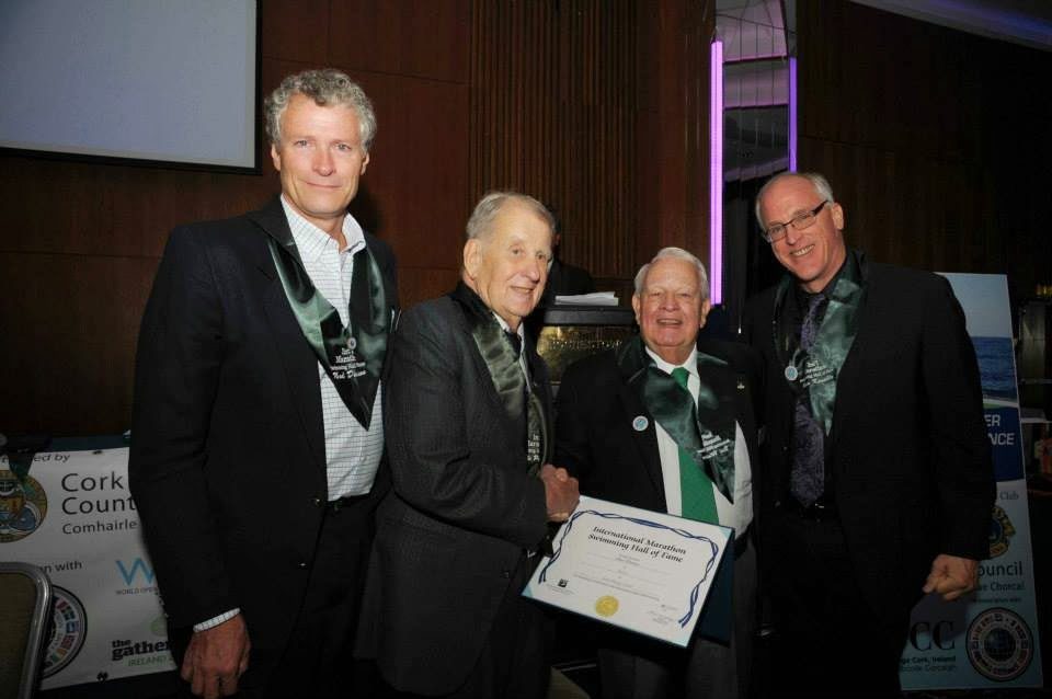 Denison is pictured on left with International Marathon Swimming Hall of Fame inductees Dale Petranech, coach Don Watson and Olympic champion John Kinsella, proving one indication that the Hall of Fame honors individuals of all shapes, sizes, talents and achievements.