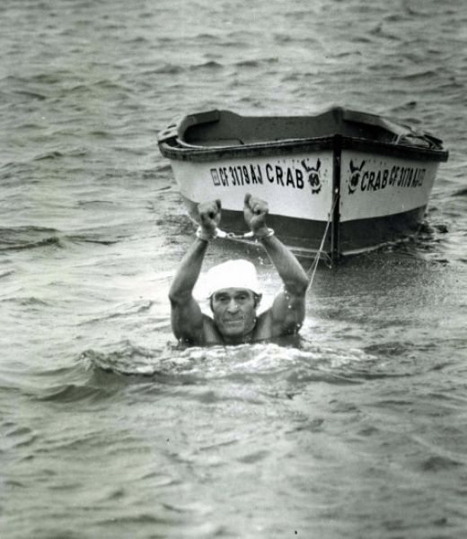 In 1955, he swam from Alcatraz Island to Fisherman’s Wharf in San Francisco while handcuffed (photo above).