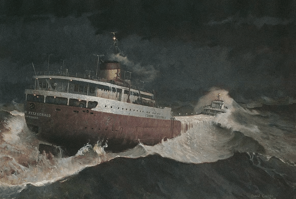 The 729-foot S.S. Edmund Fitzgerald was bound for Detroit carrying over 26,000 long tons of iron ore when the ship went down in a violent Lake Superior storm on November 10th 1975, taking the lives of all 29 crew members aboard. The ship lies in Canadian waters, 27 km north-northwest of Whitefish Point, Michigan.
