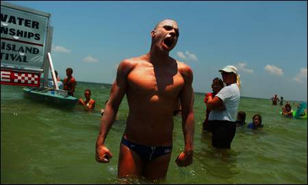 Photo shows Mark Warkentin reaches shore after a 25K ocean race.