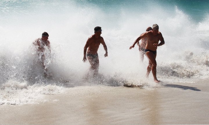 Photo above shows the men of the Patagonia Extreme Cold Water Challenge exiting from the cold ocean.
