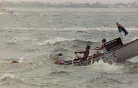 Their strength, dedication and well-worn palms of their hands were unquestionable, especially on the ocean side of the 22.5-mile course when waves and swells and currents made their job extraordinarily difficult. These young men were the unsung heroes of that famous 22.5-mile (37 km) race about Absecon Island, New Jersey. With their efforts to row in all types of conditions, they were the human engines behind the initial carbon-neutral swims.