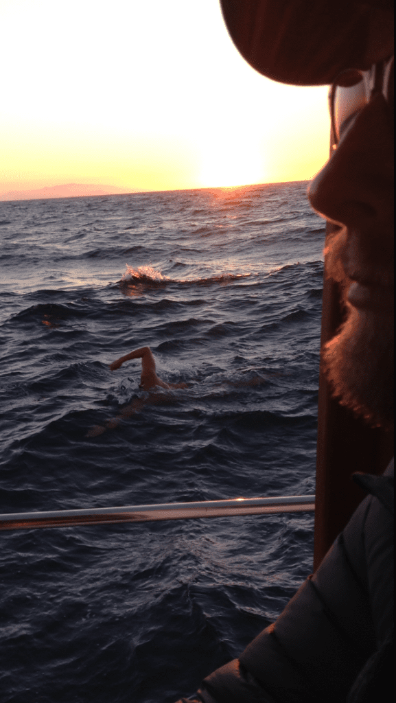 By their second sunrise, the water temperature had risen to 60ºF (15.5ºC), but “the cold patches are brutal,” says Zach Jirkovsky who like his teammates is getting in and out of the Pacific Ocean four times per day for an hour stint each. “The Southern California hospitality has gone out the window and this swim is becoming a challenge.”