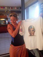 Zani Miller, an English Channel aspirant from South Africa, holds up a shirt featuring the likeness of Nelson Mandela. The shirt is being offering by Ram Barkai as a fundraiser for his upcoming Antarctic Circle Ice Challenge.