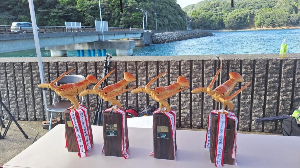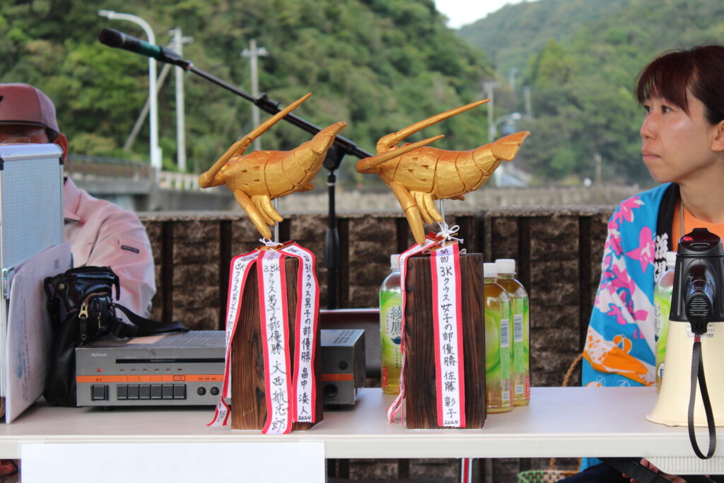 Sugimoto artfully carved the prized Ise-ebi, one of the many local seafood delicacies around Tokushima on Shikoku Island in Japan. The overall men’s and women’s winners of the 2.1 km and 3.7 km races are presented with these wonderful awards – along with several other local seafood specialities of the area.