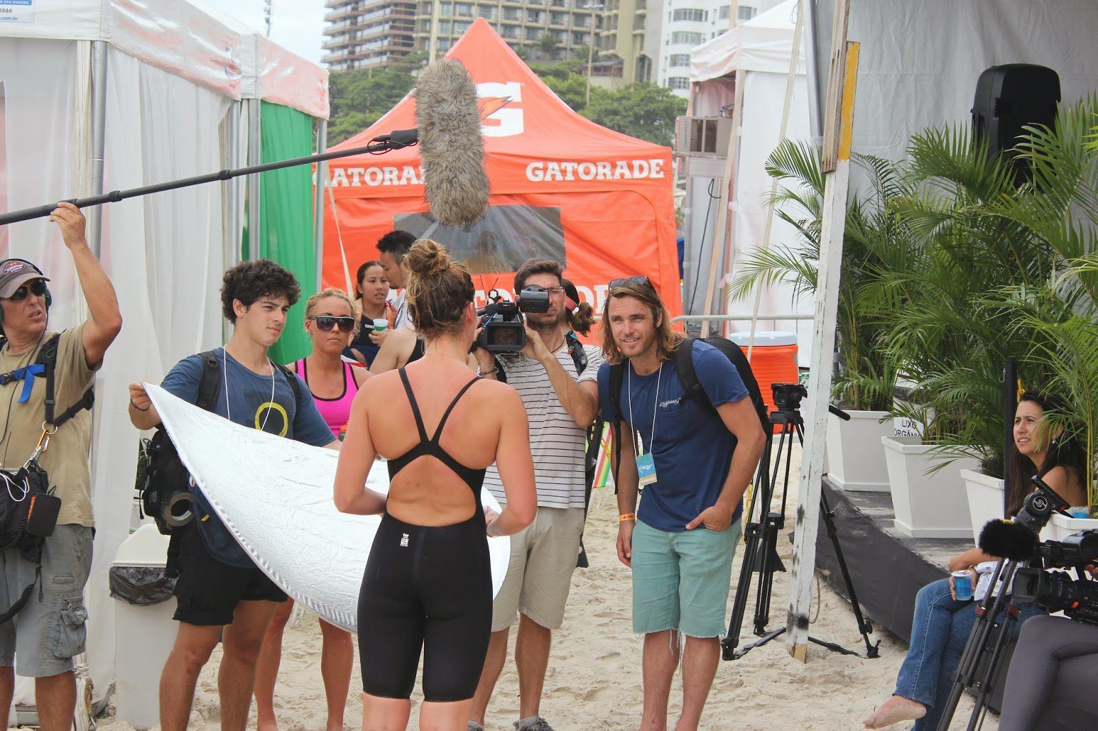 The Travel Channel interviewed American open water swimmer Ashley Twichell on Copacabana Beach in Rio de Janeiro after the King and Queen of the Sea competition.