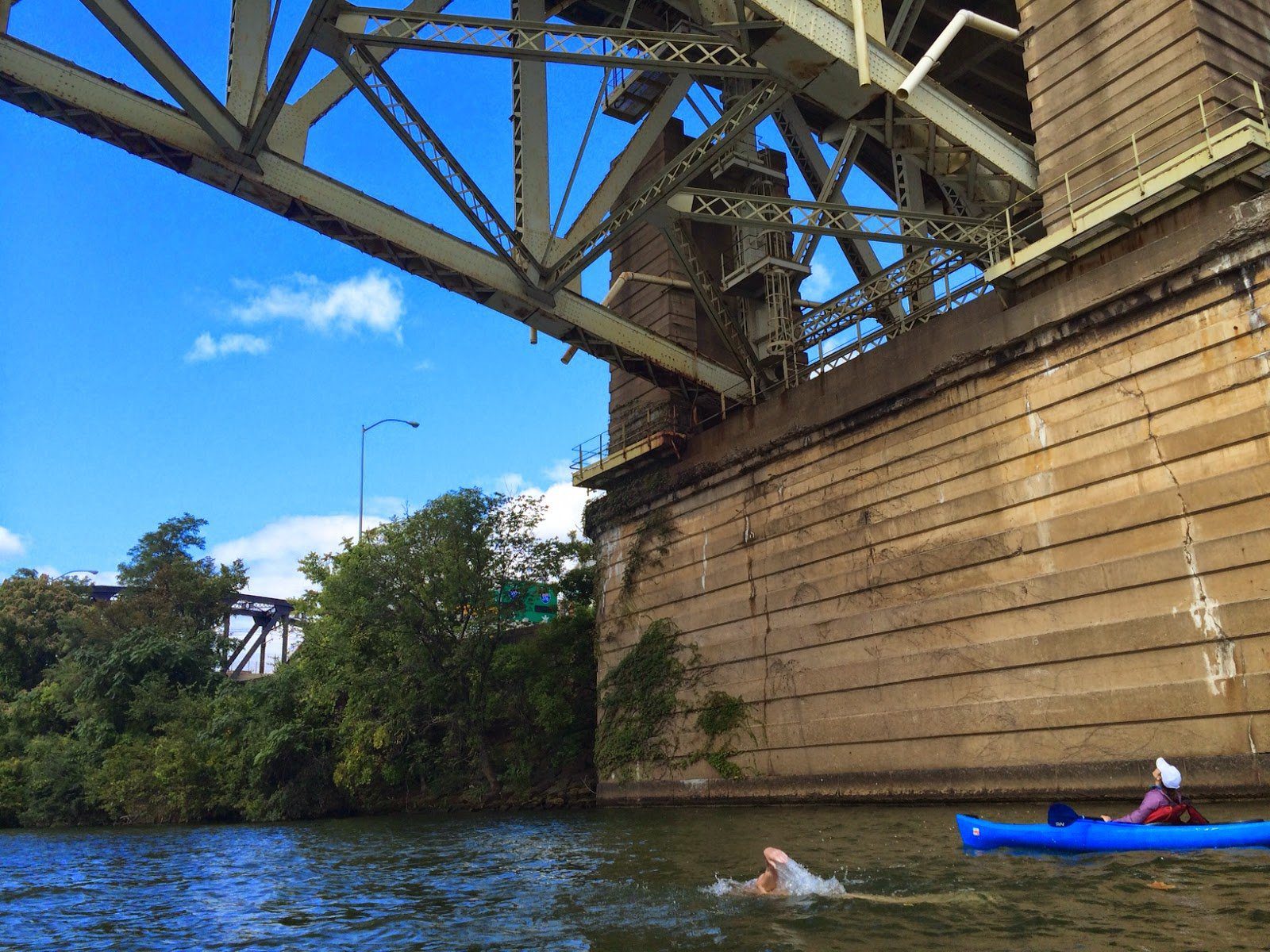 We did this test swim of 30 km that included an out-and-back 5 km course in each of the three rivers: first, the Ohio River, then the Monongahela River, and finally the Allegheny River. We had 2 kayakers per swimmer as well as powered escort boat and the Pittsburgh River Rescue and Pittsburgh Police also offering their support. The water temperature ranged from a low of 73°F to a high of 76°F as the swimmers faced flat, calm, overcast conditions in the Ohio River, choppy, windy and intermittent sunny conditions in Monongahela River, choppy, slightly windy and sunny conditions on the Allegheny River.”
