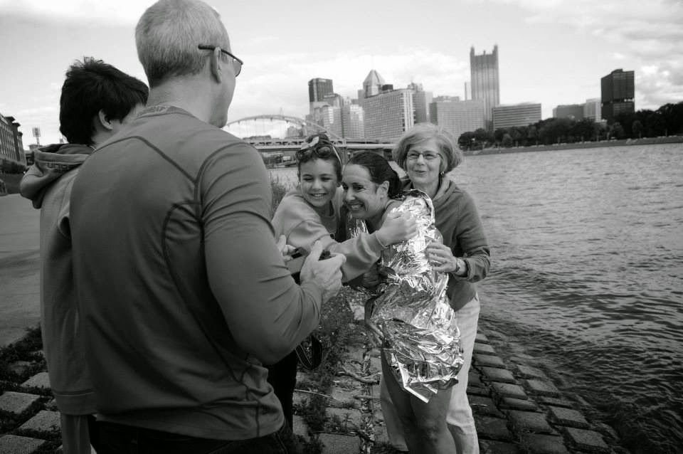 The race began with a water start from the Heinz Field (of the NFL Pittsburgh Steelers) launch at 7:34 am and swam north along a current-assisted 5 km route in the Ohio River. The trio and a larger flotilla of support crew took off under overcast and rainy conditions in cool 56°F air and warm 74°F water that was tranquil and flat. “As they turned around at Brunot Island and swam 5 km back to the city against the current, the water temperature and conditions remained steady while the air temperature began to rise. Once the swimmers hit the Point State Park 10 km mark, the air temperature continued to rise with intermittent sun occasionally breaking through the cloudy skies,” described Miller.