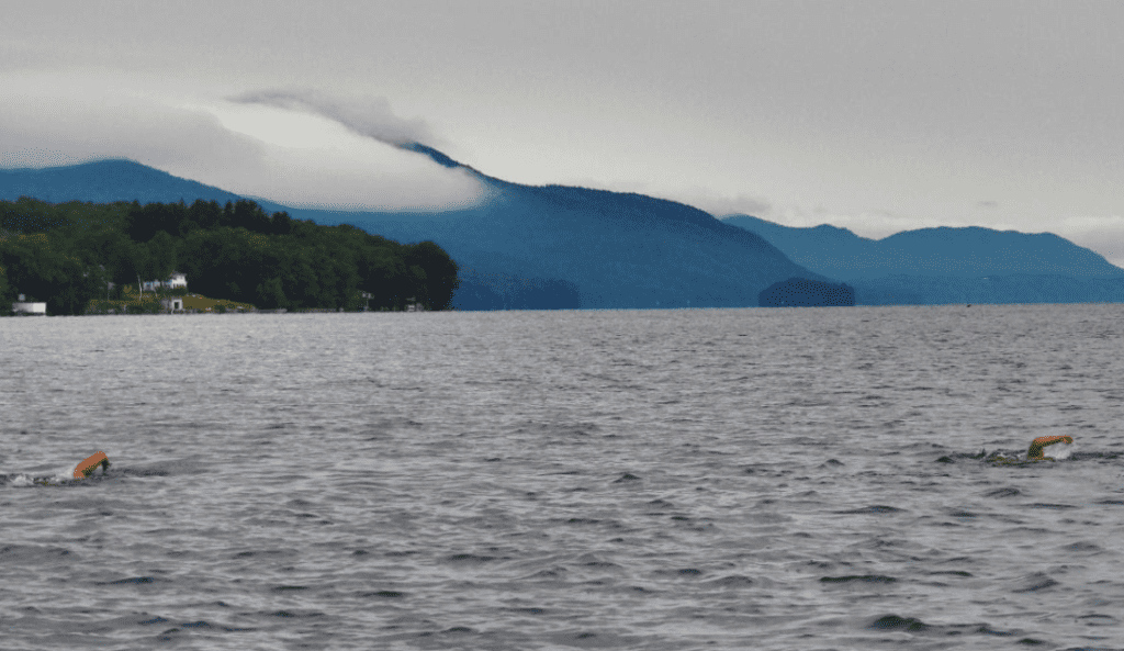 White writes, “Lake Memphremagog is known for its unpredictable and often feisty conditions. But, during this swim, the conditions could not have been more favorable, as Memphre welcomed these two Swimmer Scouts back and expressed her appreciation for the extreme challenge they chose to undertake. Water temperature ranged from 70° to 75°F. The air temperature dropped to the mid-50°F/s at night and rose to the mid-70°F’s the first day and the mid-80°F’s during the second day. The wind that they encountered was a negligible 5-10 mph with occasional stretches of wind at 10-12 mph. For at least half of the swim, water was like glass.