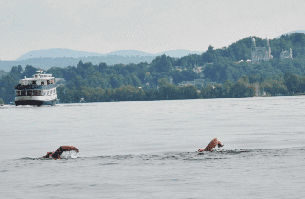 They walked up on the beach at Plage de Baie Magog in Canada to complete their first leg at 9:42 pm. They grab a few late-night snacks, re-greased themselves, and re-entered the lake at 9:50 pm. They swam through the night, into a hot, hazy summer day, and exited the water back at their starting point at 5:34 pm on August 14th to complete their 35 hours 34 minutes two-way In Search of Memphre swim.
