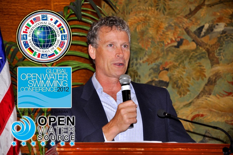 Photo shows Ned Denison accepted his International Marathon Swimming Hall of Fame honor on the Queen Mary in Long Beach, California.