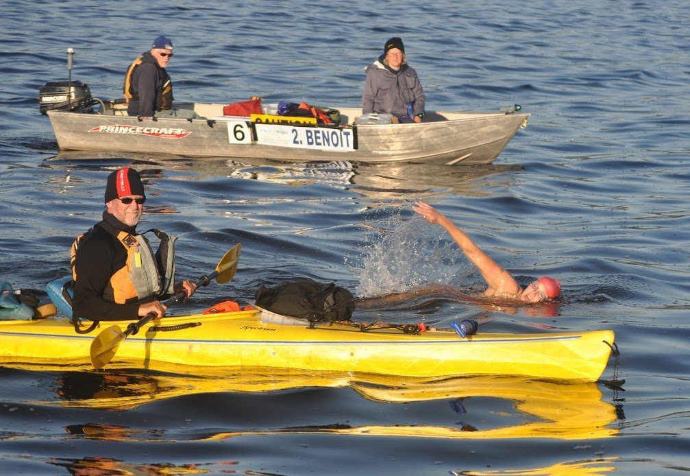* Cynthia Needham is a 69-year-old crew member and kayaker from Hyde Park, Vermont: As a Contributor – Crew and kayaker in numerous Northeast Kingdom Open Water Swimming Association events including Sarah Thomas’ 50-mile double crossing In Search of Memphre in 2013 and Charlotte Brynn’s many swims on Lake Memphremagog and on seven marathon swims (and attempts) from California to New York and England.