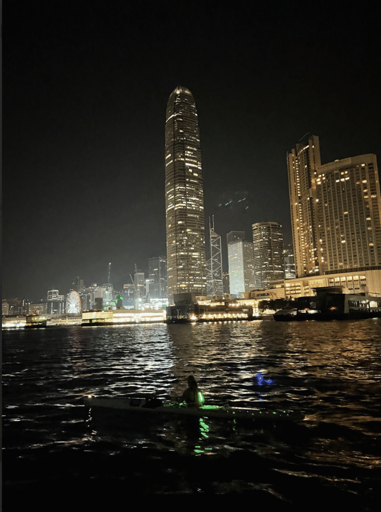 I was lucky to have people at the starting pier shining lights for me, which made me feel calm. Madison, my paddler, looked like a Christmas tree on the water, and it was time to go. The first three hours were the hardest. I was swimming through the iconic Hong Kong harbour with dazzling lights everywhere. The water was choppier than I expected, and I was getting cold.