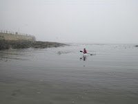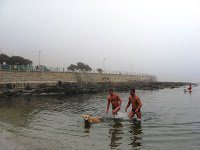 The inaugural 5.3 km Atlantic Dash, postponed for a week due to unsafe conditions, got off on misty and cold conditions with the water temperature between 12-12.5°C (53.6-54.5°F).