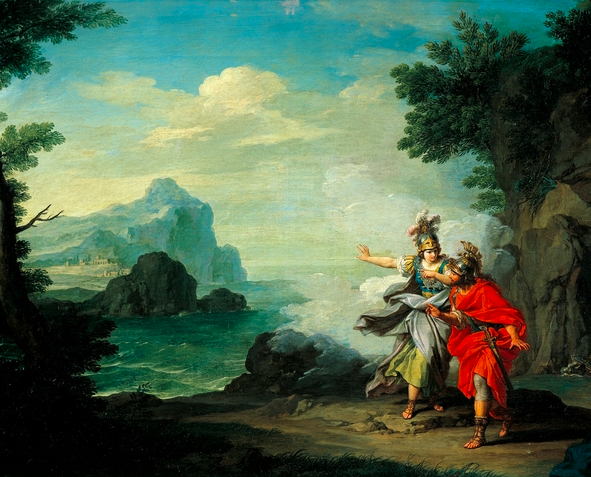 Painting shows of Athena Revealing Ithaca to Ulysses (Odysseus) by Giuseppe Bottani (18th century).