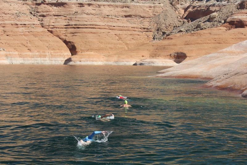 Lake Powell, seen from above, is site of Britney Spears’ I’m Not A Girl, Not Yet A Woman video as well as Martin Strel‘s 4-day open water swimming holiday tours and camps.