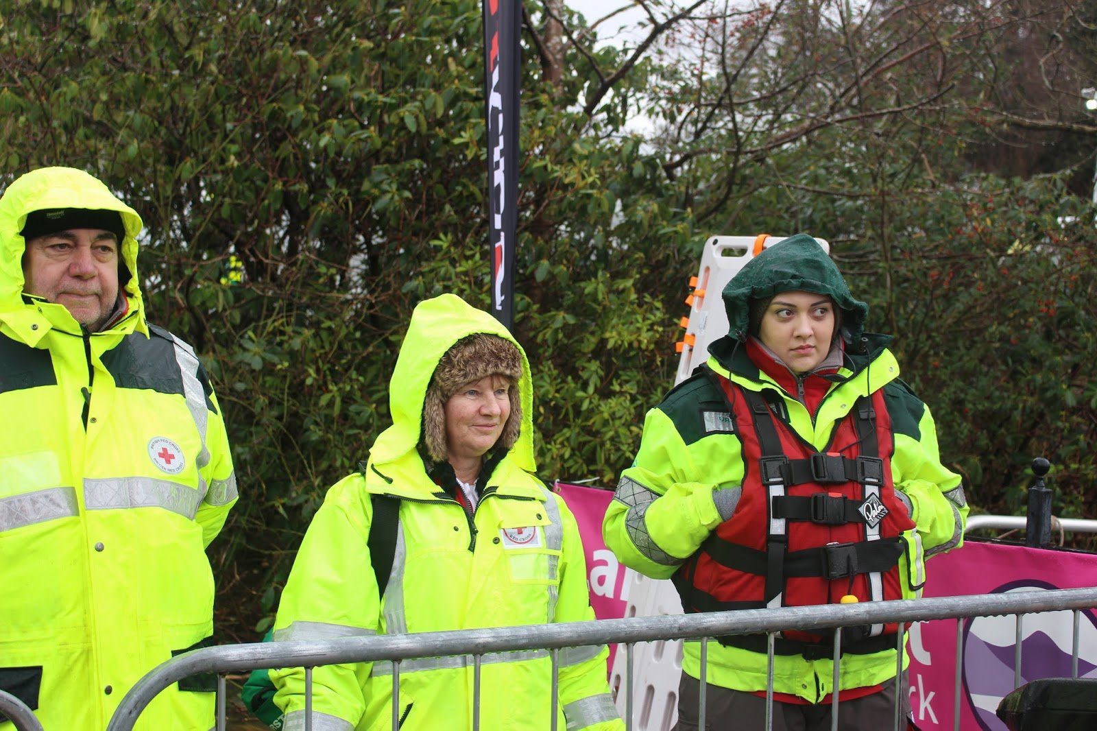 The second impression is the vast dichotomy between the clothing, footwear and headwear of the swimmers and the race volunteers and staff.