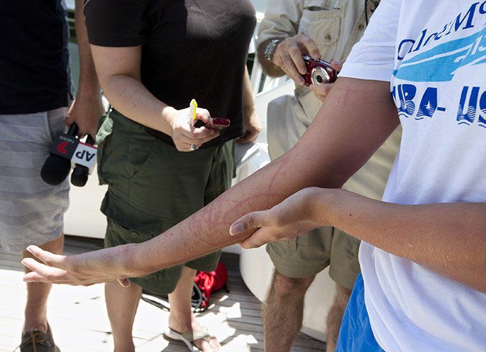 Just as canaries in the coal mines were the front-line indicators of danger in previous generations, open water swimmers currently serve as indicators of the growing menace of jellyfish in the world’s oceans. We believe many more ocean goers will be more frequently stating those kinds of statements like Cutti did over the next few generations: There will be no escaping them.