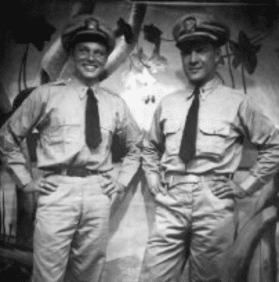 The Museum exhibit explains, “During their early missions, Navy combat swimmers were completely clothed in combat uniforms, boots and metal helmets. That changed during a mission in preparation for the invasion of the Japanese held atoll of Kwajalein in January 1944. Ordered to conduct a reconnaissance mission to assess beach conditions in advance of the planned assault, the two man team of Ensign Lewis F. Luehrs and Chief Petty Officer Bill Acheson [shown below on left] could not get close enough to shore because of a coral reef. They stripped to their underwear and swam over the reef to complete the mission undetected, becoming the first “Naked Warriors.” Following the success of that mission, training emphasized strong swimming skills and operating without the use of lifelines, wearing only face masks, swim trunks and fins.”
