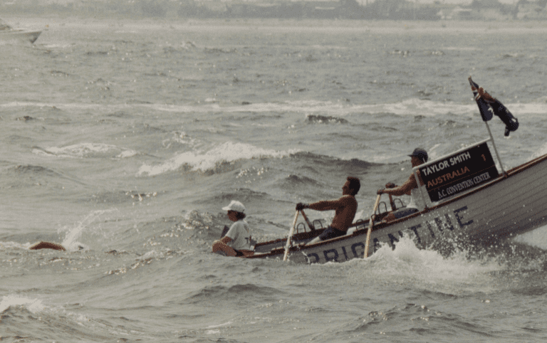 Photo above shows 7-time world professional marathon swimming champion Shelley Taylor-Smith swimming in froggy conditions with handler Nancy Schnarr in a rowboat racing in the Atlantic City Around the Island Swim held in New Jersey, USA.