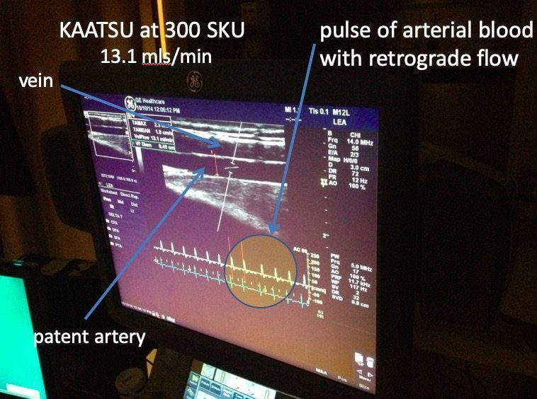 The ultrasound image on left shows the brachial artery and brachial veins at 300 SKU during KAATSU of a 21-year-old collegiate athlete remains unobstructed without occlusion.