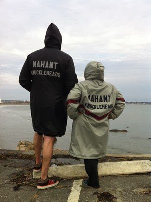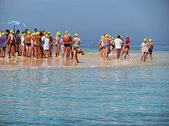 Upper photo above shows the Nukasiga Sand Bar that is exposed twice per day along the Fiji Swims 18 km course. Lower photo shows Jerome Leslie with Nahant Knuckleheads teammate Elaine Howley.