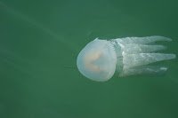 Jellyfish come in different sizes, shapes and colors – and many of them sting really bad – see examples here. The jellyfish on the left face swimmers in the North Channel; the blue bottles on the right face swimmers in Australia.