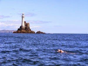 Upper photo shows Phil Cutti, David Holscher, Zach Jirkovsky, Luane Rowe, Blair Cannon, and Grace van der Byl of the Night Train Swimmers walking onshore after a 228-mile non-stop relay down the California coast between 22-26 August 2013, escorted by Vito Bialla, Hal McCormick, and Patrick Horn. Lower photos shows Stephen Redmond swimming around Fastnet in Ireland.