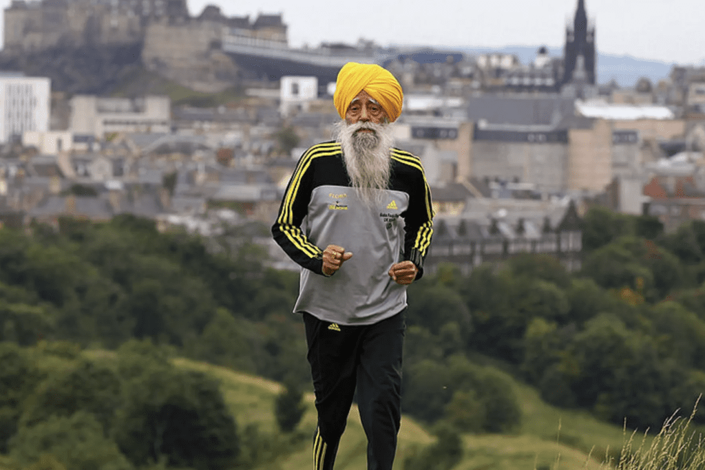 Fauja Singh, known as the Turbaned Tornado (see photo on right below), a retired farmer and British Sikh marathon runner originally from Punjab, Indian origin, ran a full 42 km marathon at the Toronto Waterfront Marathon on October 16th 2011 in 8 hours 11 minutes – at the age of 100 years.