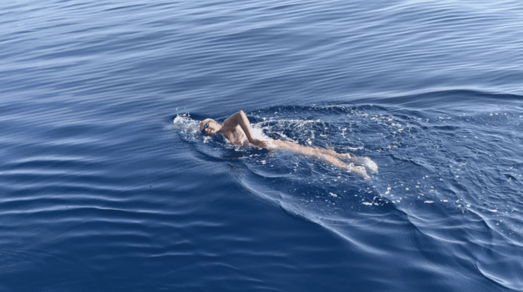 Approximately two hours from his finish, about 8 hours into his swim, Sowerby suddenly stopped because he felt a dramatic drop in the water temperature. The water temperature within a 100-meter area at a depth of between 50-70 meters decreased from 20°C to 14.5°C. The tough Aussie was hardened, but the water temperature shift was a kick to the gut and made him focus.