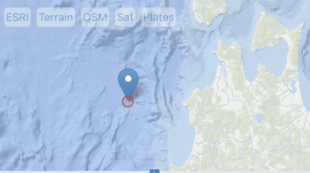 A magnitude 2.5 earthquake hit the Sea of Japan at 8:14 am – which was 4 hours 8 minutes after Sowerby started on the Kodomari Cape. The earthquake had a very shallow depth of 7.2 km and was not felt on dryland in the area, but the earthquake epicenter was 40.633°N / 139.12°E while Sowerby was approximately at 41.1243°N / 140.2479°E or about 513 km to the east – that led to his 90° turn and a sudden 6.5°C temperature drop.