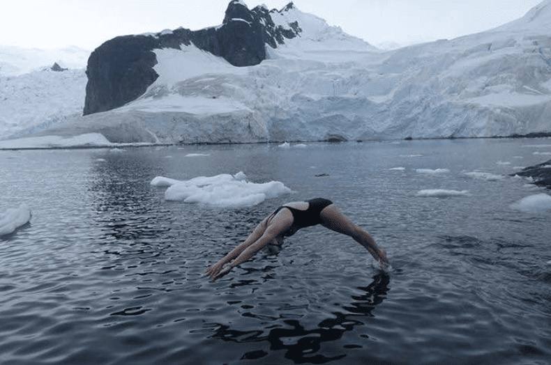 Or the photography and logistical support provided by Arik Thormahlen when Jaimie Monahan swam in Paradise Harbour in Antarctica (shown on left above) and many other locations on her unprecedented ice swimming adventures. Similarly, when Gabe Souza helps profile International Marathon Swimming Hall of Fame Honor Swimmer Pat Gallant-Charette (shown on right above).